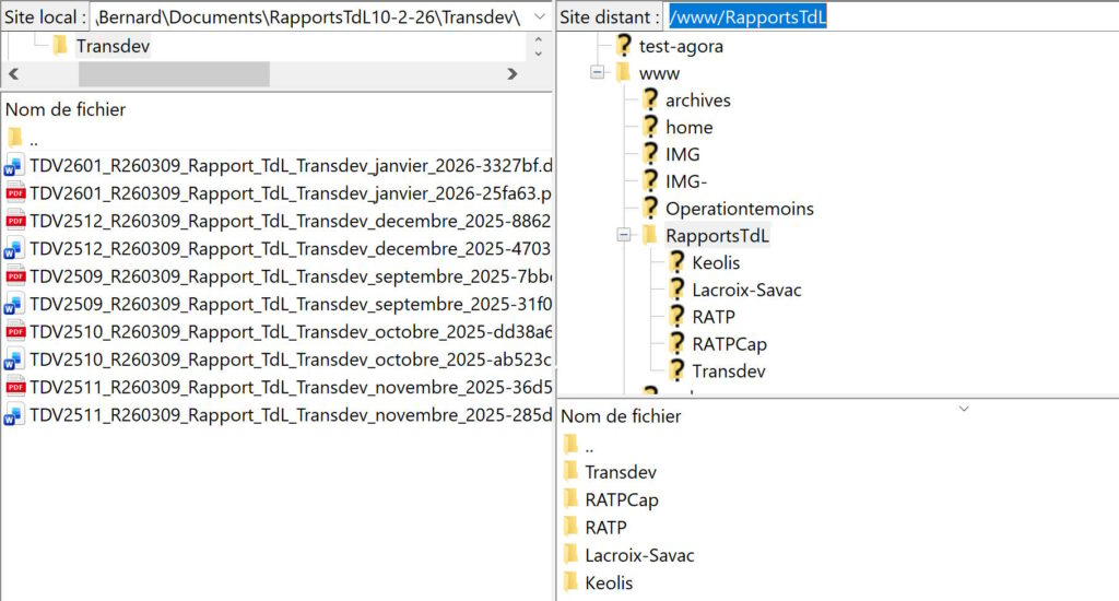 Une fois que les fichiers docx et pdf ont été créés en local, on peut alors les transférer sur le serveur. La connexion sur filezilla étant opérationnelle, il faut avoir