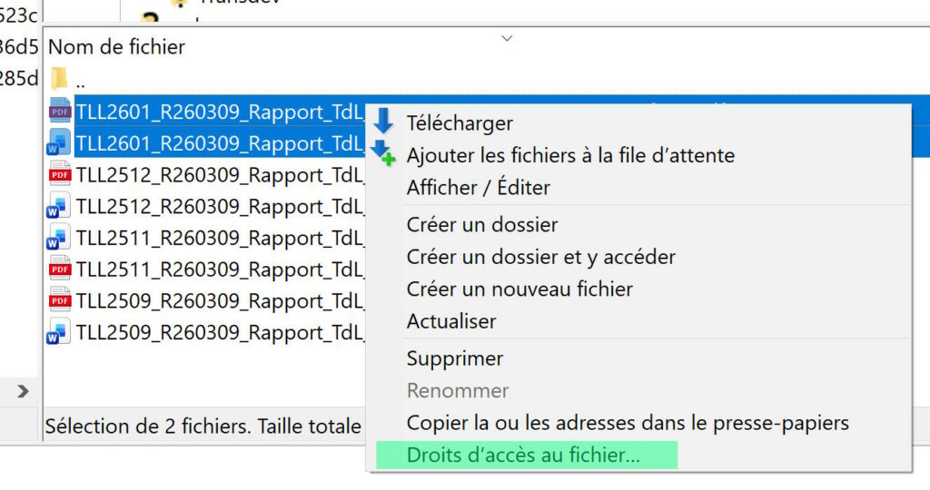 Une fois les documents transférés et donc visibles dans le répertoire de droite, il faut leur attribuer les bons droits d’accès. Pour cela il faut les séleectionner (éventuellement tous ensemble) puis sélctionner dans le menu accessible par clic droit : « Droits d’accès au fichier… »