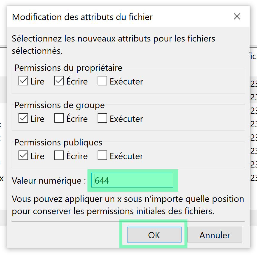On arrive ainsi à une fenêtre où on met 644 dans la zone surlignée de vert et on valide par OK. 644, cela veut dire que le propriétaire du fichier peut lire ou écrire (modifier) le fichier et que les autres ne peuvent que le lire.